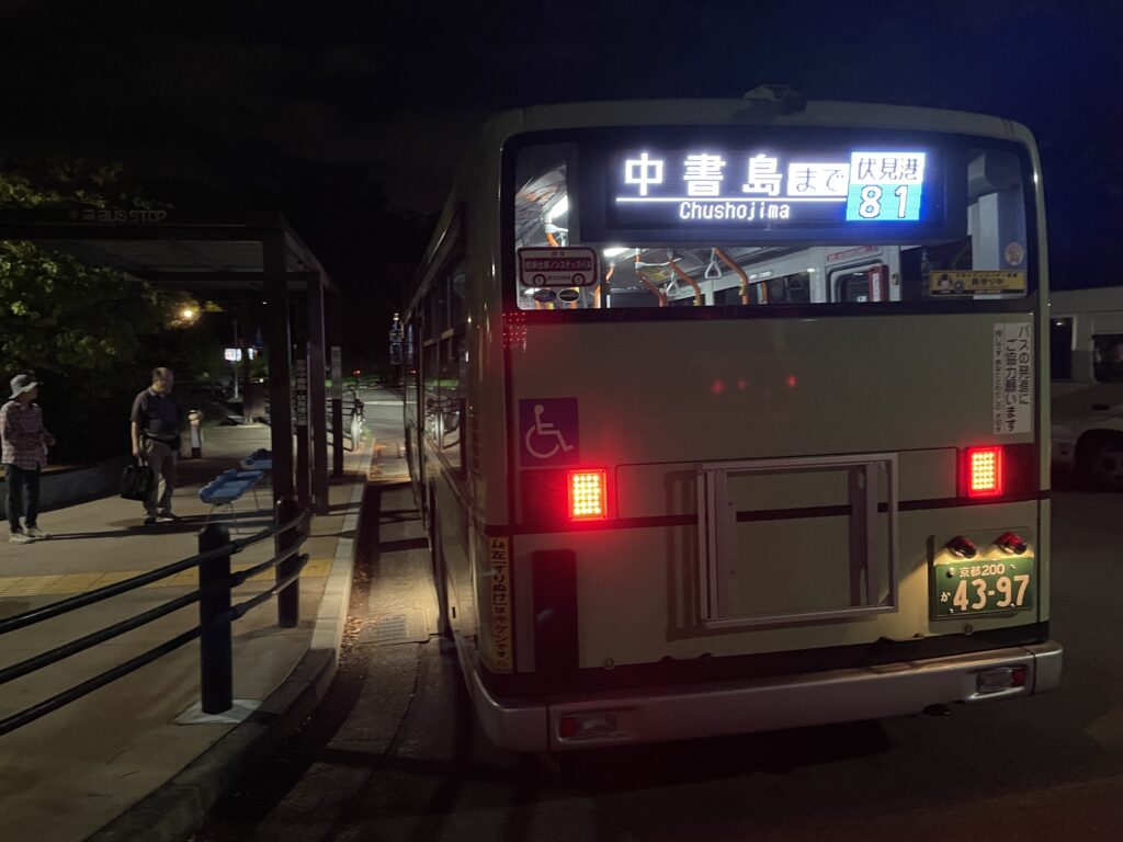 I will be starting on this Kyoto City Bus bound for Keihan Chushojima Station, departing at the same time at 5:46 PM. I wonder what time I will arrive at Kintetsu Okubo Station.
