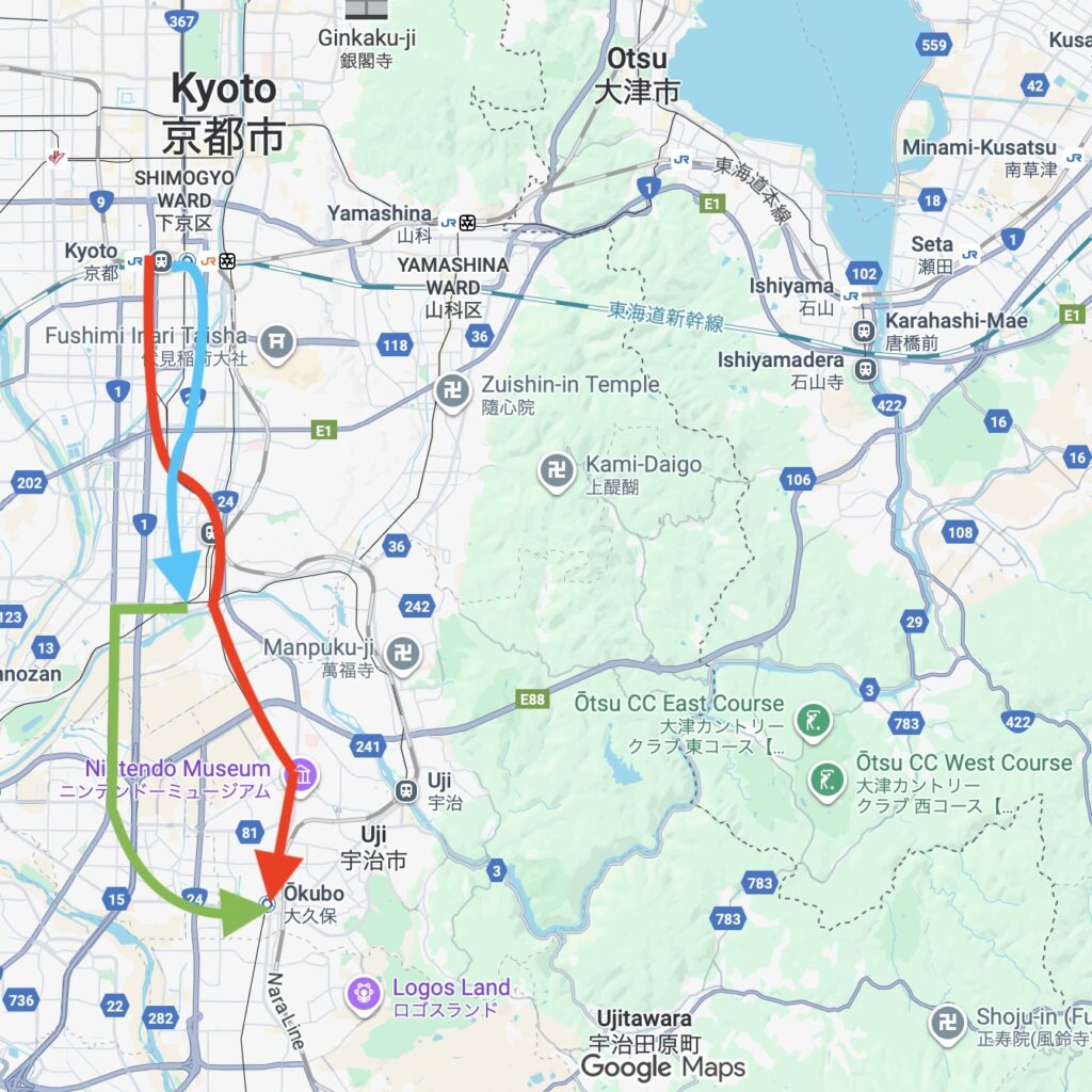 If you take the train, it is 13.6 km from Kyoto Station to Kintetsu Okubo Station, and if you take the express train departing at 17:46 you will arrive at 18:03.