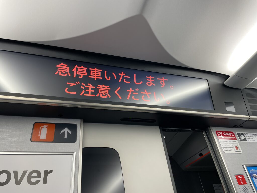 Just as I was thinking that, the emergency brakes were activated just before arriving at Kyoto Station and a sign like this appeared.