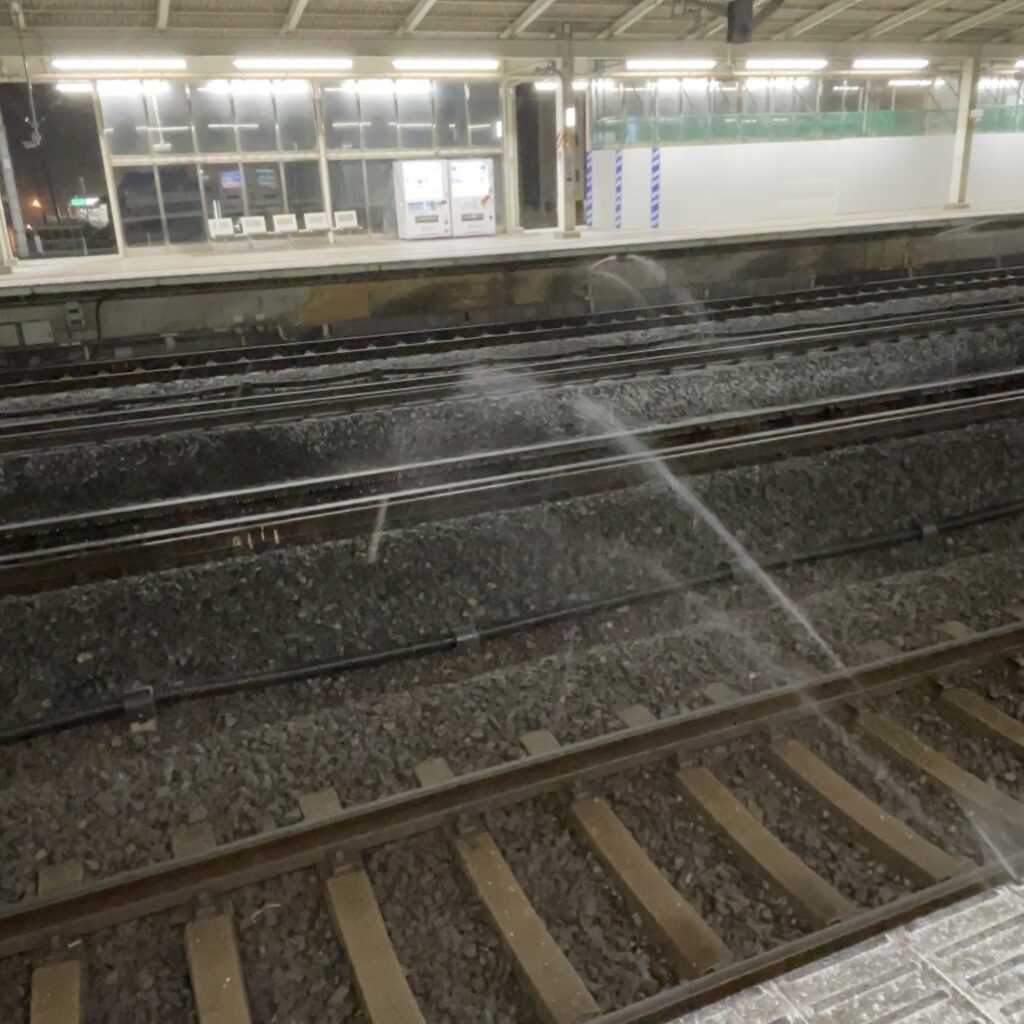 At Maibara Station on the Tokaido Shinkansen line, sprinkler systems were in operation to remove snow from the train cars.