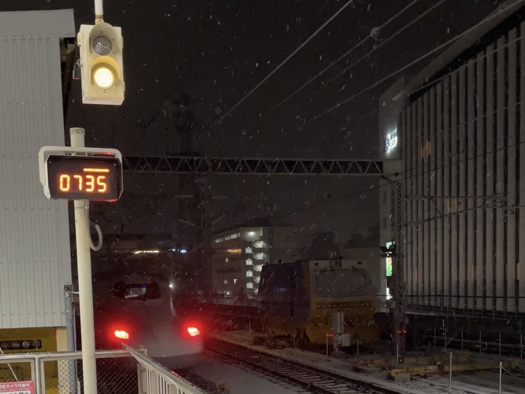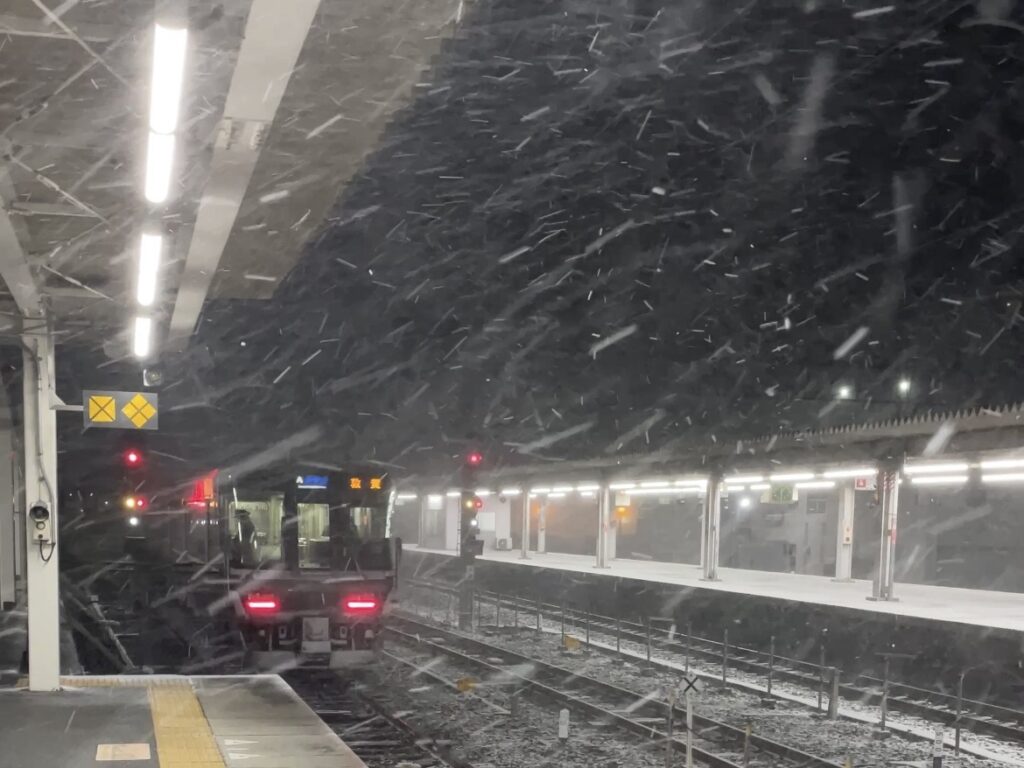 新幹線の京都駅ホームでは、うっすらと雪が積もっていました。