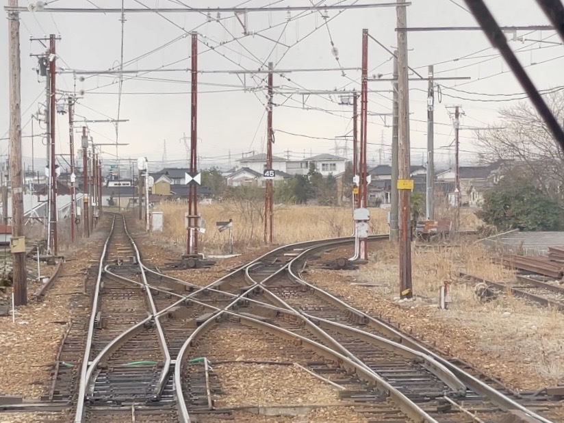 私たちが乗っている列車は進行方向を変えて、分岐器右側の路線に進んでいきます。