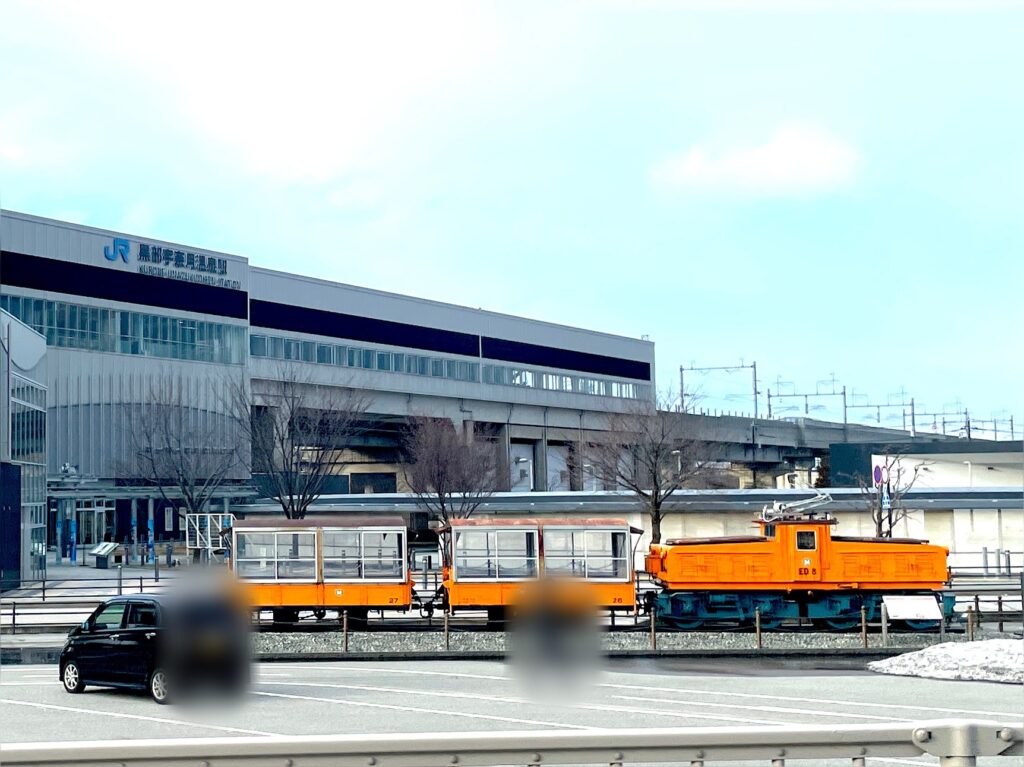 手前に見えているオレンジ色の電気機関車と客車は、この先こ宇奈月温泉駅から走る黒部峡谷鉄道の展示用車両です。