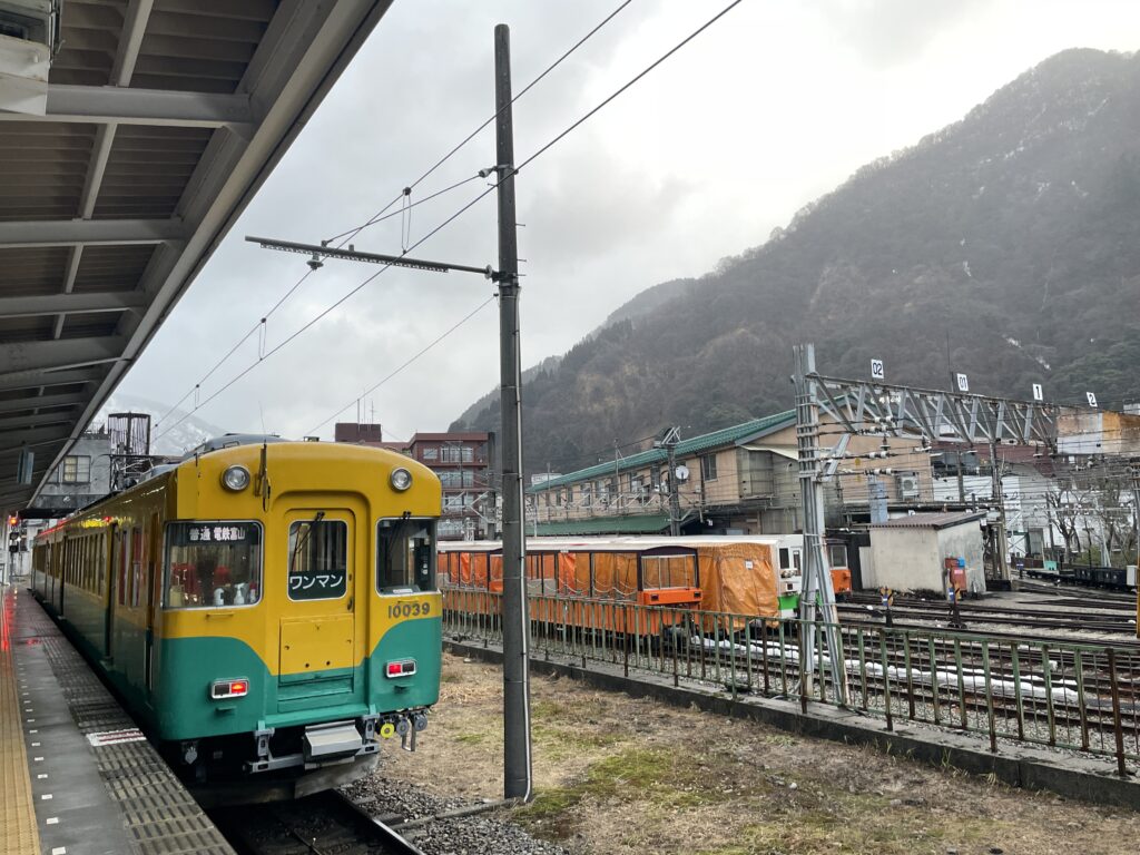 The train visible in the background is a Kurobe Kyokoku ( = Gorge ) Railway train, which originates at this station.
