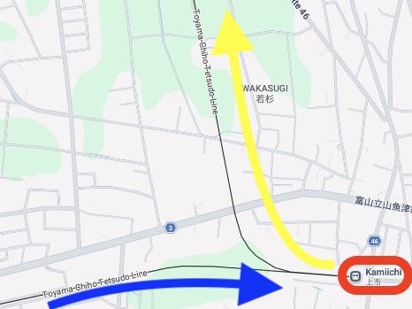 Here is a map of the area around Kamiichi Station, on the way to Unazuki Onsen Station ⬇️